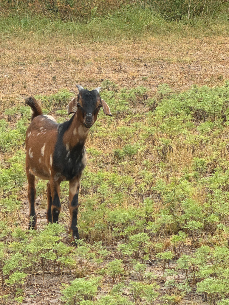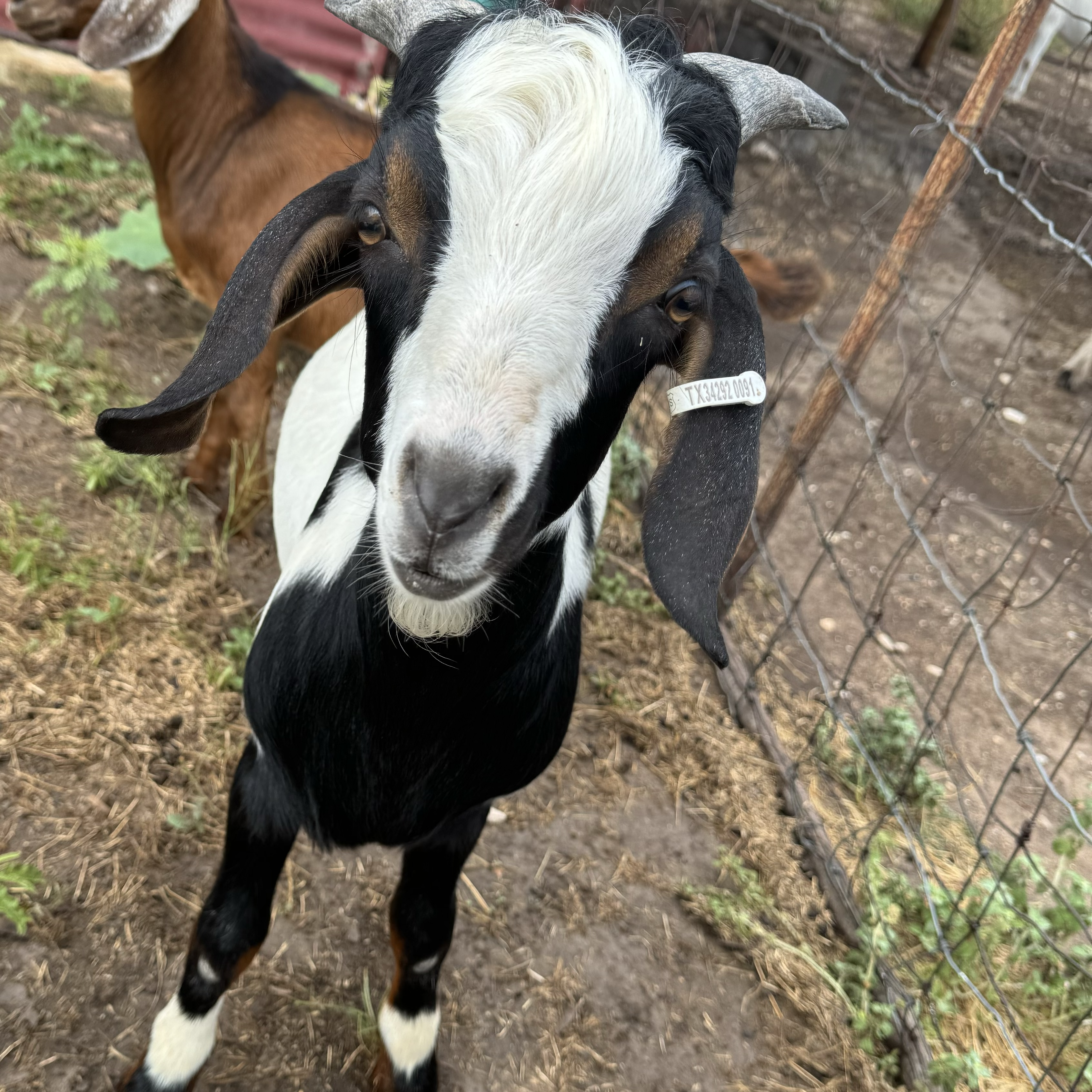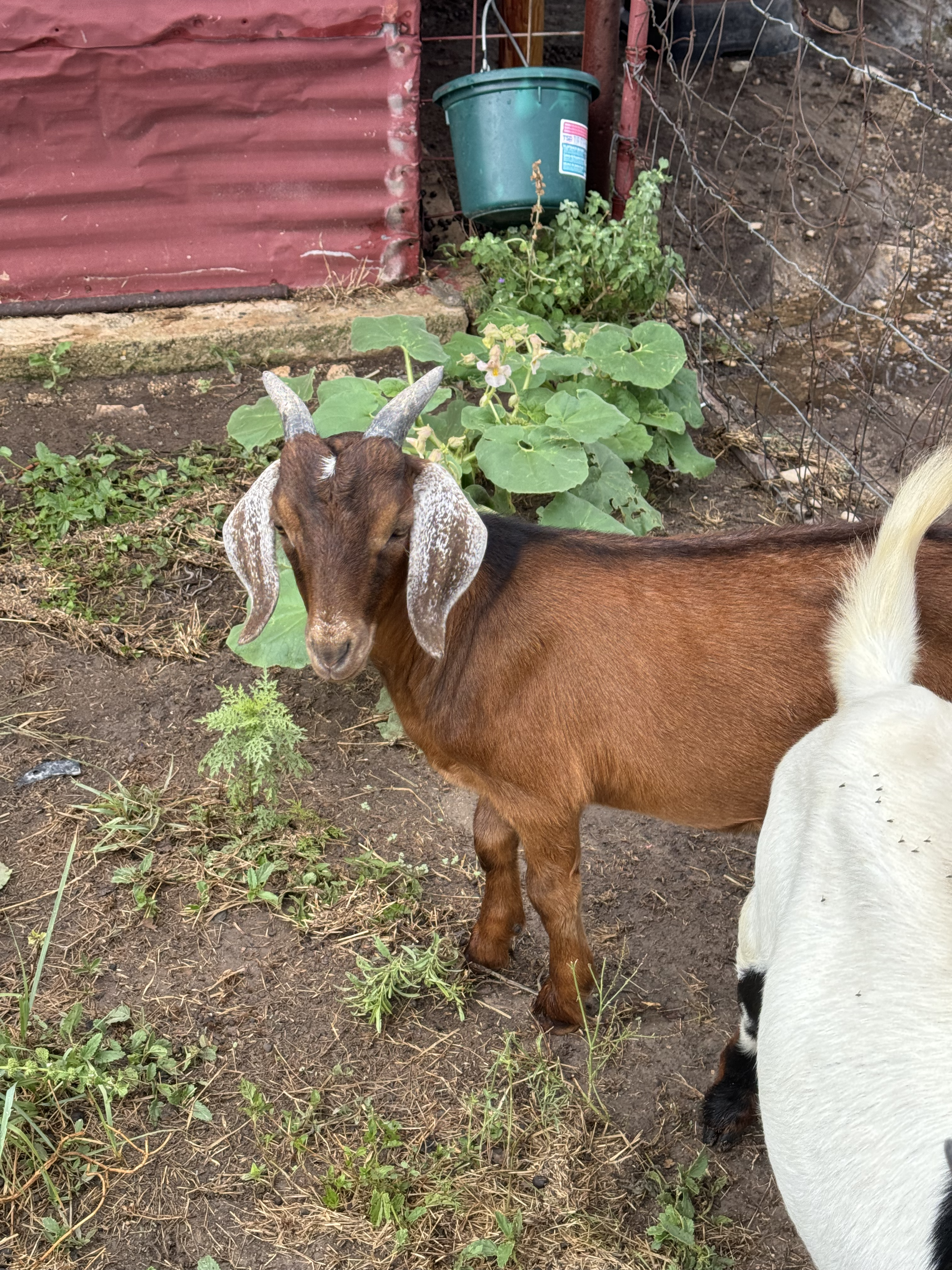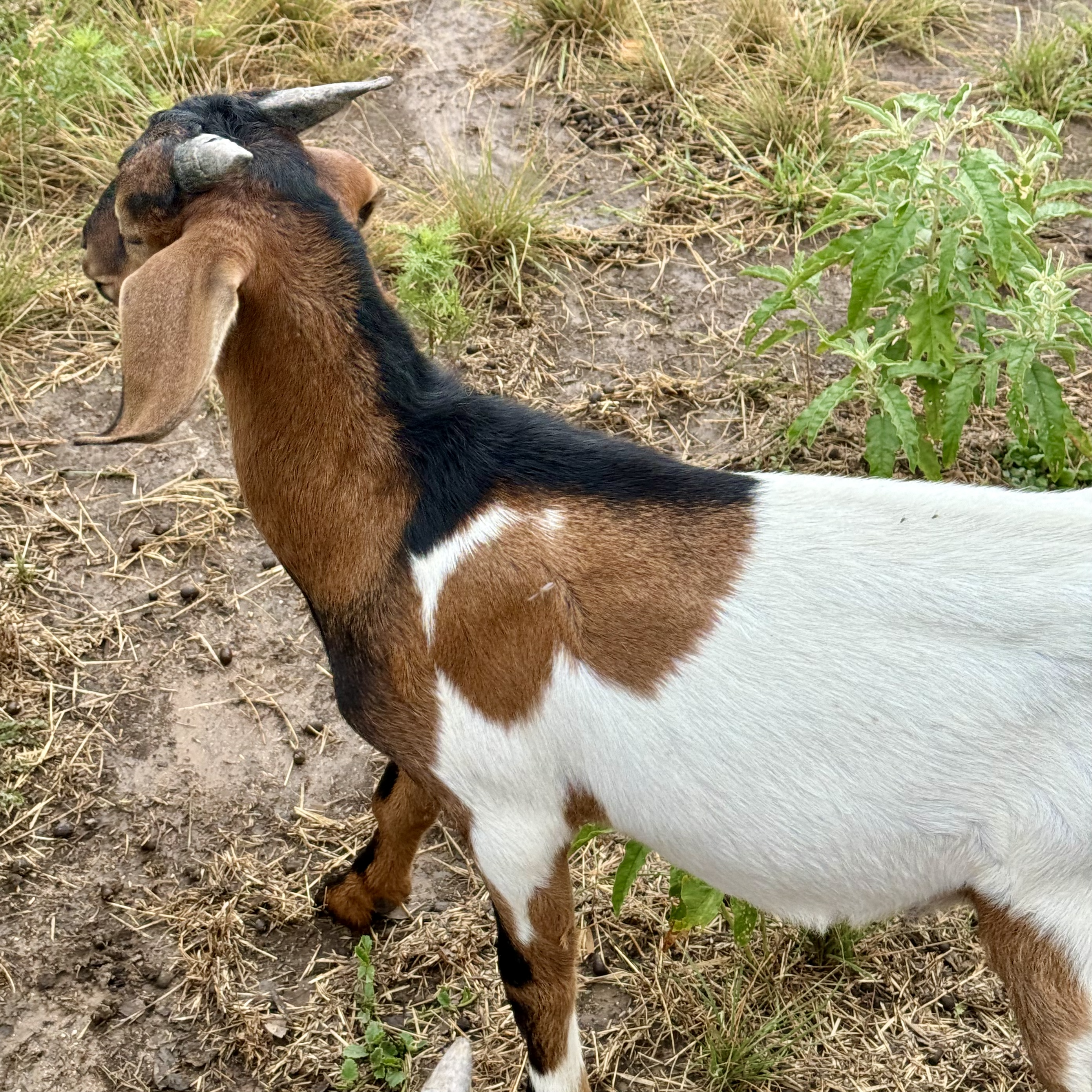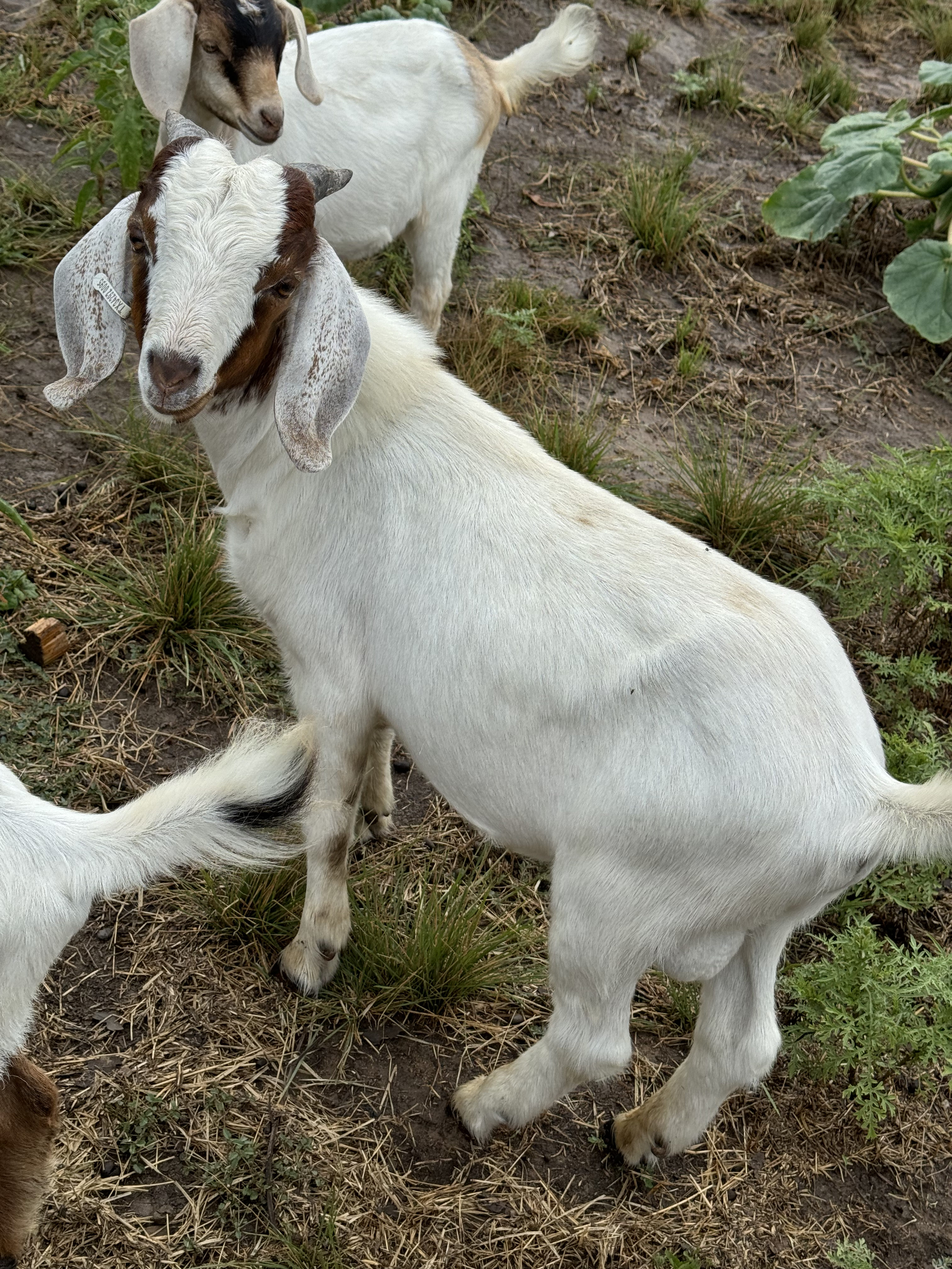 Checkers: 1/2 Boer and 1/2 Spanish billy. Beautiful goat, would make excellent kids. This cross breeding helps make goats that are both tame (Boer) and more parasite resistant (Spanish). Born 4/2/24. A little cautious but can be friendly. Can provide info about his parents. Contact us to learn more.